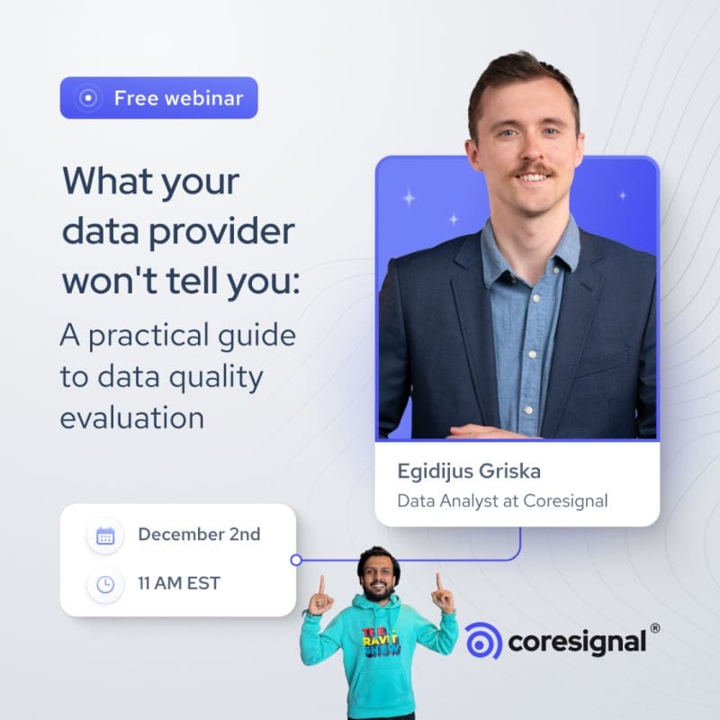 That’s why I’m excited about Coresignal’s upcoming webinar. It will show you how to evaluate the quality of any external B2B dataset through a practical 6-step framework that removes guesswork and vendor spin.